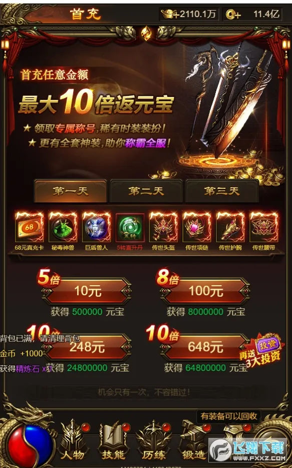 装备获取轻松:材料全爆,装备靠打,挂机一整年背包都不会满。上百件专属装备,件件可换充值,打到一件就能咸鱼翻身。
