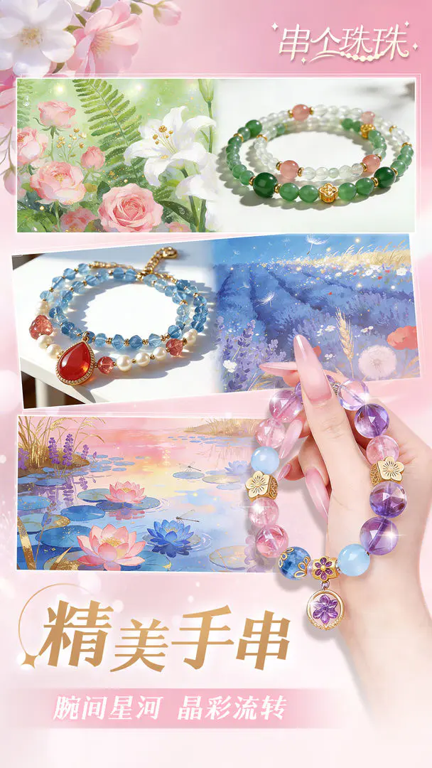 通过新颖有趣的小游戏解锁不同珠子,考验反应能力,激发创造力。成功挑战后获取丰富资源,助力手串制作。