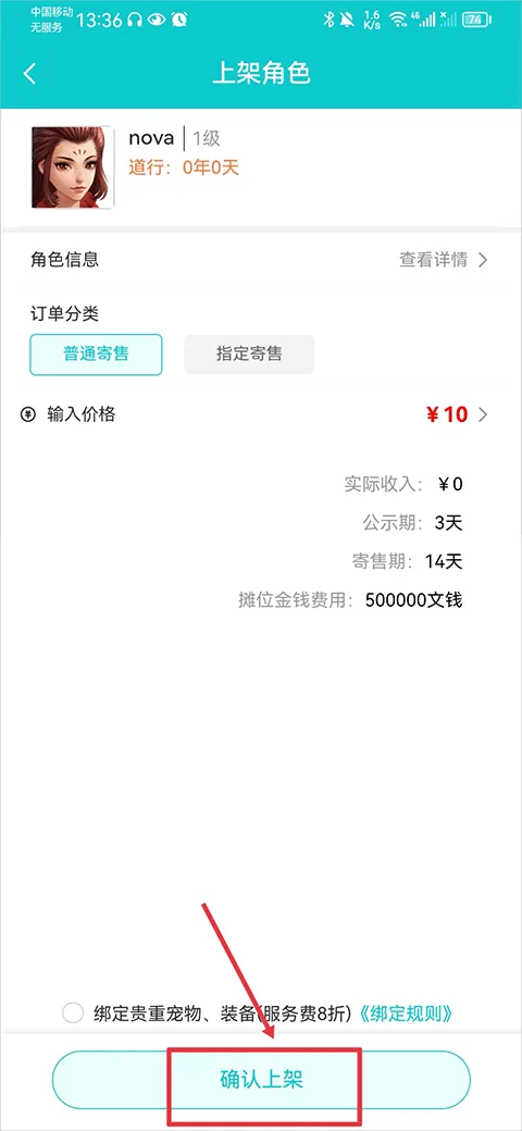 4、例如发布角色时,在上架页面选择分类并输入出售价格