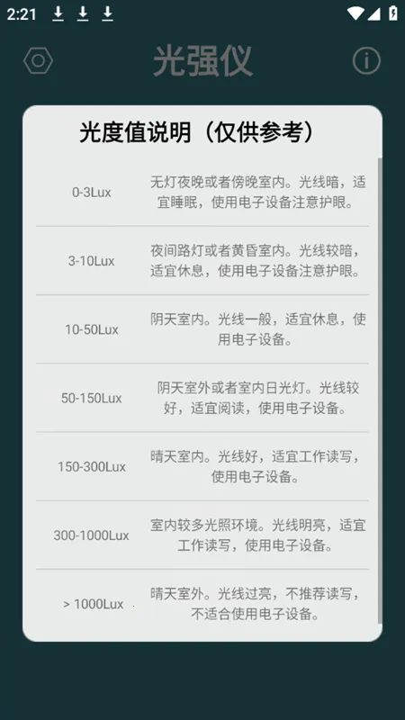 如果你想知道光强仪多少标准是正常的,那这款光强仪App就能帮到你。它能把你的手机变成感光仪器,通过光线传感器精准测量光强,并数字化展示。它支持勒克斯Lux和呎烛光Fc双单位显示,测量范围覆盖0 - 100,000Lux,误差低于3 ,数据很可靠。