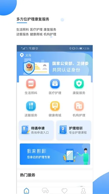 我来照顾2025最新版本是专为老年人及需护理人群设计的综合养老服务应用。与多机构合作,提供多方位护理康复、生活照料等服务,支持定制餐品、代办事务,适配多种政策,有智能化提醒与数据分析等亮点。
