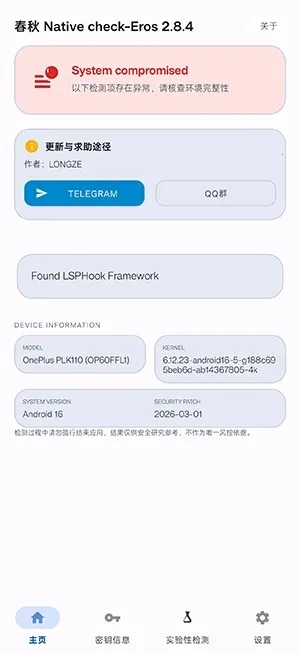 春秋 Native Check 是一款出色的手机检测工具。它能为用户提供精准透明且可信赖的设备环境分析服务,让用户清晰掌握手机底层运行状态。其内置深度检测逻辑与多重交叉校验算法,可全面扫描与核验系统环境等。软件能清晰展示设备信息,轻量化运行不影响手机正常使用。操作简易,一键启动检测后生成可视化报告。还会针对安全风险预警,给出提示与规避建议。在设备状态排查等场景表现稳定,操作简洁无广告,整体实用性强,是关注设备安全用户的优质之选。