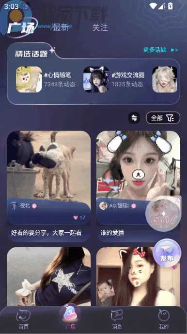 3. 广场话题:多元话题可结识同好,用户能参与热门讨论,分享生活、倾诉感受,找到志同道合的伙伴。
