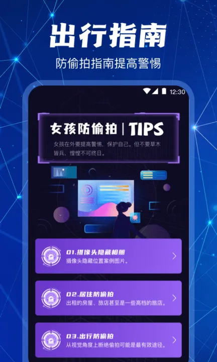 1. 一键检测快速分析,是您手机上的防偷拍专家,全方位保护出行投宿隐私安全。