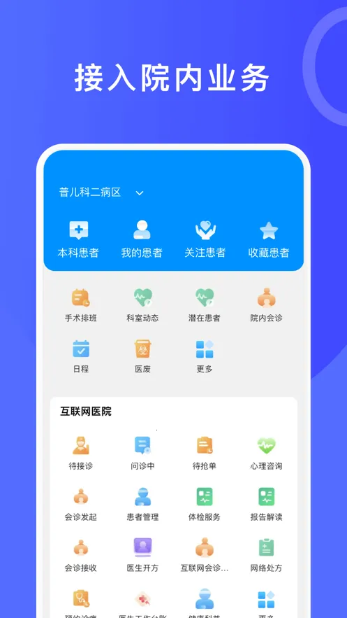 2. 支持在线诊疗、院内业务管理、病程管理等,实现多端协同合作,高效问诊。