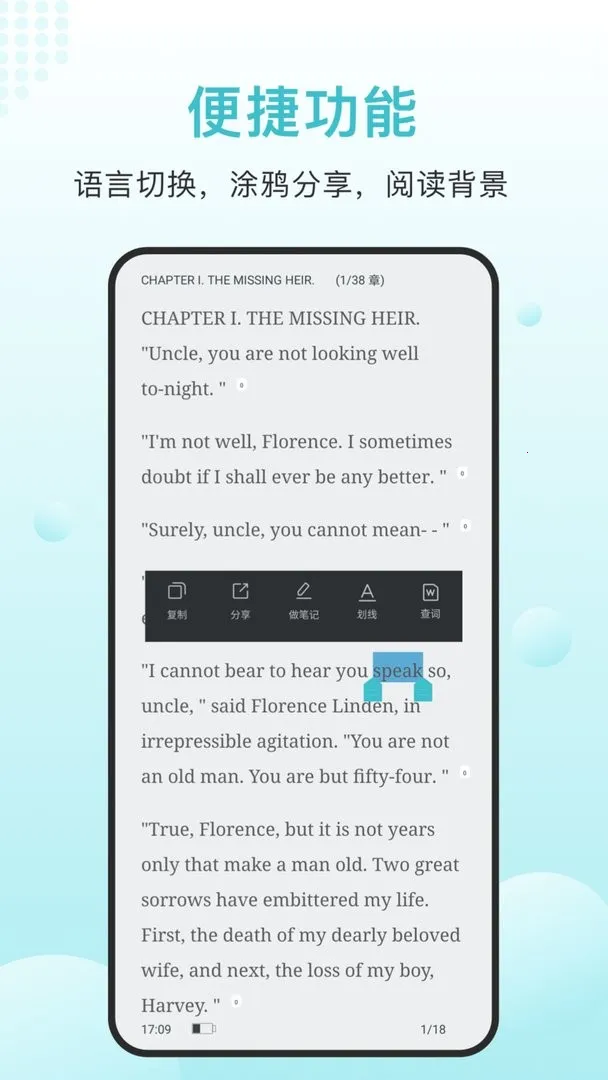 2. 学习超便捷,支持一键加入书架和书签,方便管理,更支持离线阅读;查词翻译功能强大,阅读时随时找生词,单词本助你温习;还有纯中文、纯英文及中英对照翻译服务,助你理解英文书籍。学习便捷功能多样