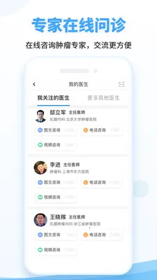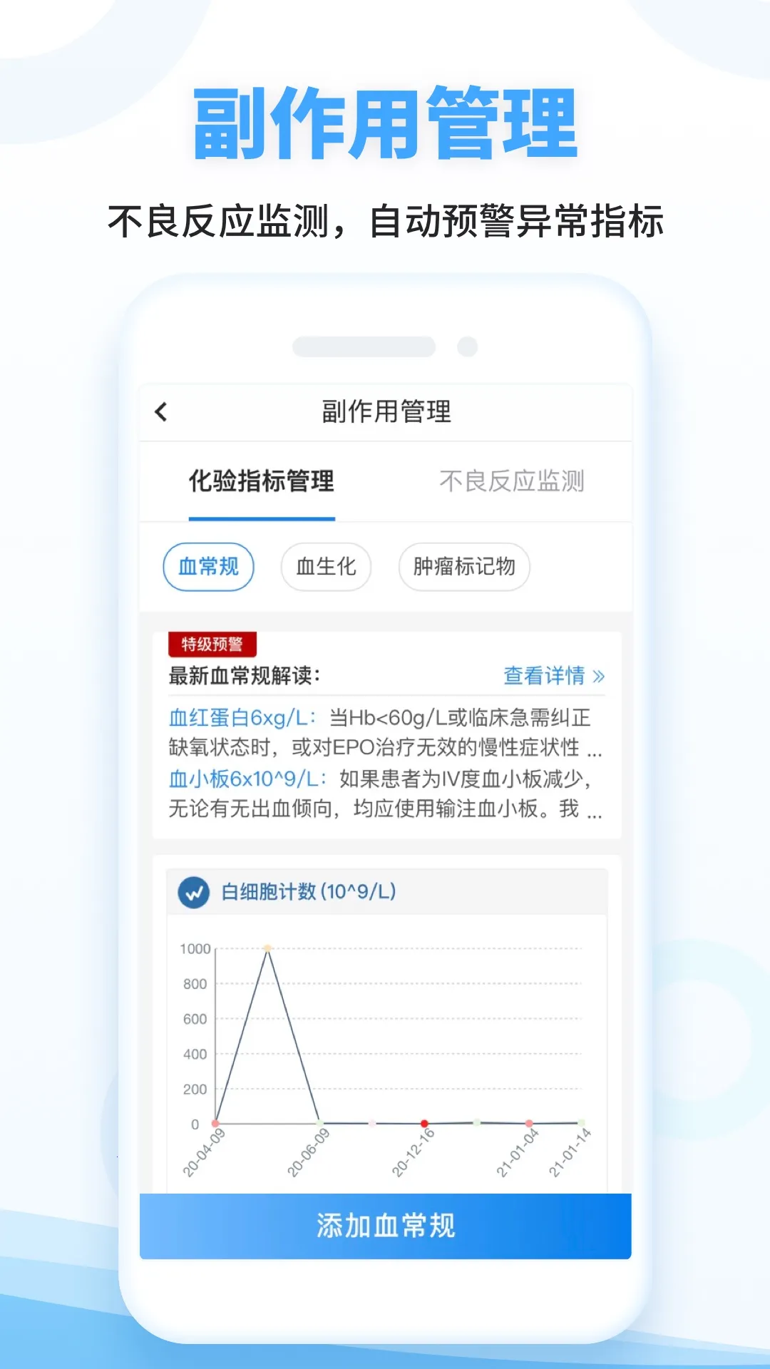 4. 多样服务保障健康:副作用管理可监测身体指标变化,自动预警异常;专家在线问诊多种方式便捷沟通全国知名肿瘤专家;还有专家义诊、新药临床试验等服务,为患者带来更多希望。