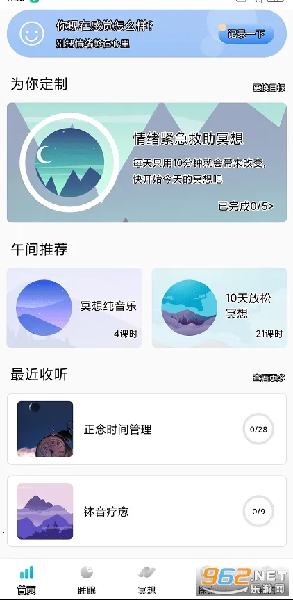 Now正念冥想是一款专注于帮助用户减压和提升专注力的应用程序。它提供了多种专业课程,适合任何需要放松心情的人。通过每天花费5到10分钟进行冥想练习,用户可以享受一段宁静的时光,有效缓解焦虑、改善睡眠质量,并使思维更加清晰。