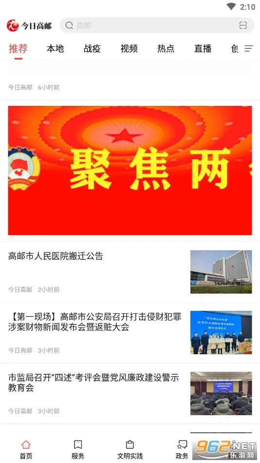 今日高邮2026官方正版是高邮市融媒体中心发行的新闻资讯平台,含新闻发布、政务服务、文明实践、生活服务等功能。有要闻、视频等栏目,能查政务、生活缴费,还可线上问政、参与志愿活动,满足多样需求。