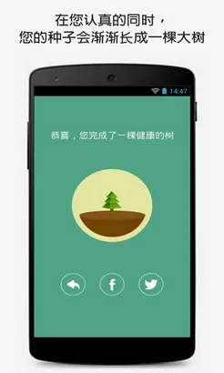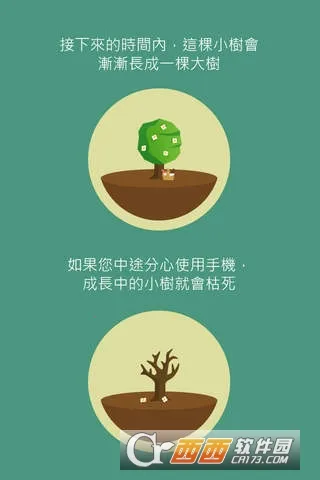 独特种树机制:种下种子,30分钟内不碰手机(电话除外),它会长成大树,否则枯萎,用使命感和成就感助你远离手机成瘾。