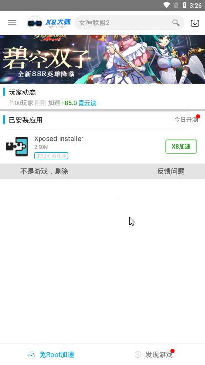 使用时,先选择要加速的游戏,点击X8加速,然后按提示卸载原版,安装带X8加速补丁的版本,就可以开始玩游戏啦。它还有很多实用功能,比如独特的游戏加速玩法,能让你体验不一样的游戏操作;设有发现游戏板块,为不知玩什么游戏的你推荐资源;简单的游戏搜索功能,帮你快速找到想玩的游戏内容;支持问题反馈,遇到问题能及时解决;还有应用分享玩法,好东西大家一起用。有了x8加速大师,游戏体验更畅快!
