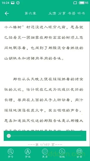 3. 阅读体验良好:UI风格清新,独创空山翠护眼风格,带来舒适感与独特品位。阅读界面简洁轻松,支持进度跳转、自动保存书签、切换阅读模式,还新增听书功能,提供五种声音及慢速、正常、快速三种语速选择。