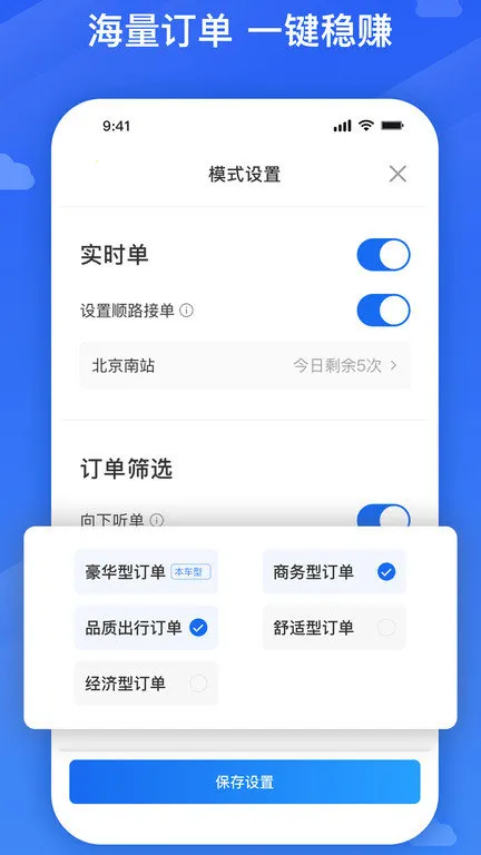 1、操作流程设计简单明了,各类司机的接单需求都能得到满足,通过快速设置接单参数,可以自主管理行程订单,平台订单持续更新,接单过程无需担心佣金扣除。