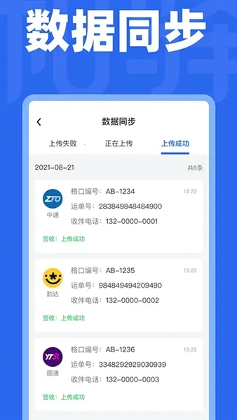 2、数据实时同步:所有数据实时同步,提高了快递配送效率,还能减少快递员工作量,避免因操作延迟导致罚款。