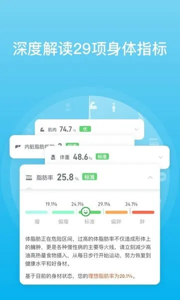 精准数据监测:无论您身处何地,都能及时准确地监测体脂率、水分含量等多项身体指标,帮助了解身体动态变化。