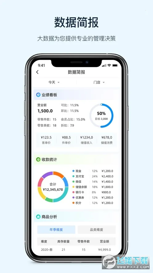 2. 数据展示直观,有透明的业绩看板,可直观展示每种商品的销售量比重,还有数据简报版块,让用户清晰看到门店业绩等信息。