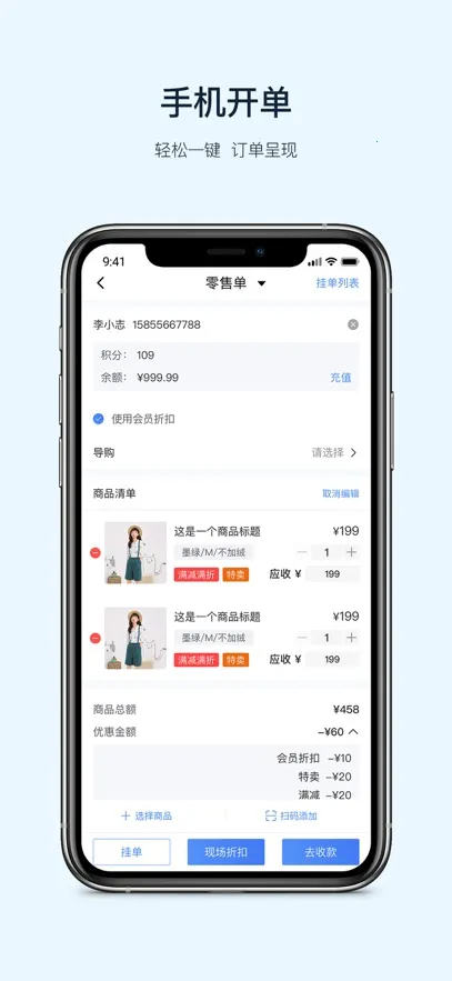 3. 操作便捷,能一键群发短信维系会员关系,支持手机开单,一键收款,还可及时办理充值等。