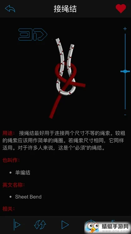 Knots 3D是一款超棒的绳结学习软件。它由国外公司推出,能让用户快速学会打绳结。软件提供100多个独特的结,还有多种语言版本,如中文、丹麦语等。其特色在于3D动图展示,可360度全方位学习,还能变速观看,方便又直观。支持按类别浏览、收藏绳结。无论是攀岩、露营还是划船等活动,它都能成为你学习打绳结的得力助手,助你轻松掌握各种绳结打法,对绳结有全新认识,强烈推荐!