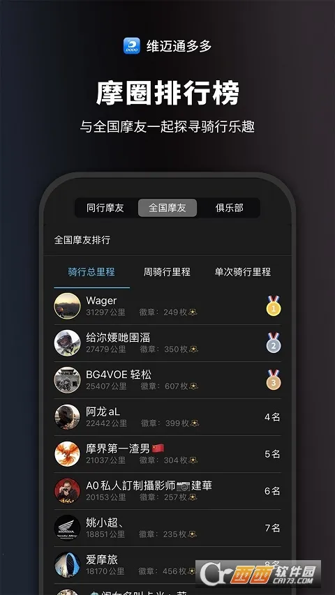 4. 摩圈功能丰富,涵盖骑行数据全国排行、车友排行、俱乐部排行等。