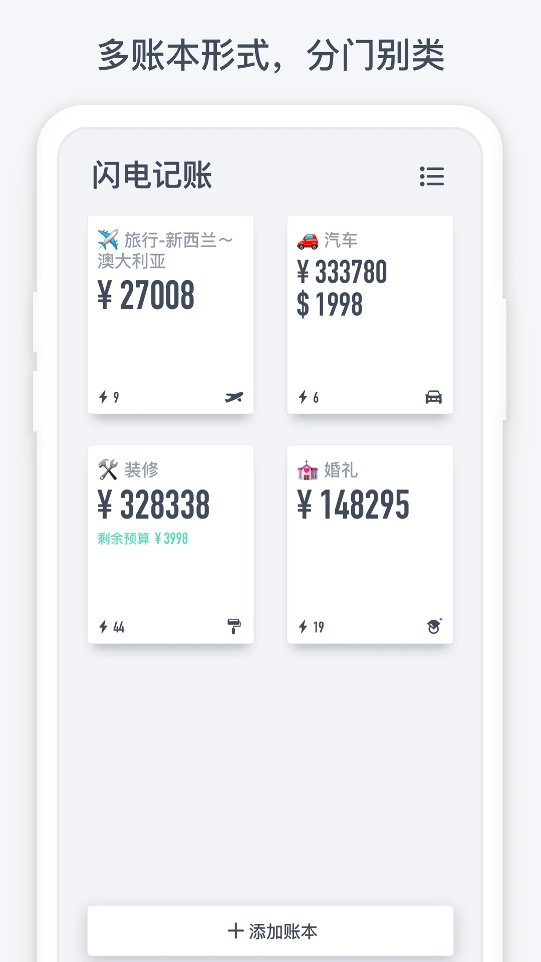 闪电记账 2026 最新版本是一款极简记账工具。操作简便,两步快速记账,有多场景模板。支持多账本管理、智能统计可视化、多货币与云端同步。界面简洁无广告,还有高级版专属权益,满足日常消费、项目追踪及家庭共享等记账需求 。