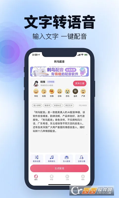 1. 海量主播:近300位风格各异的优质声音,多种风格变幻,满足多样配音需求。