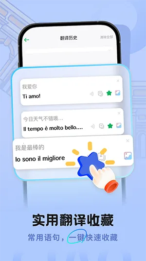 意大利语翻译助手2026官方最新版本是安卓手机软件,主打精准互译与即时沟通。支持语音文本等多种方式,覆盖多场景需求。有丰富词库、例句参考,能保存记录、收藏词句,提升口语,操作便捷,是全方位翻译学习助手。