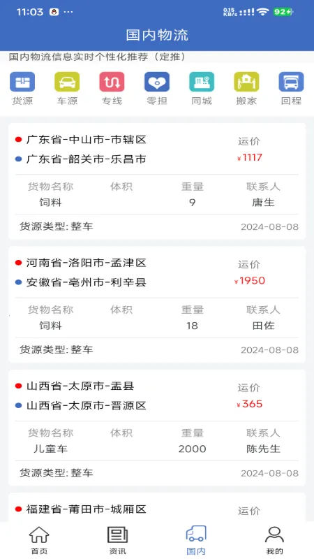 海量信息资源:涵盖物流前沿资讯、国内车源货源、物流专线、零担物流、同城货运、国际货盘等海量信息,无论是物流人还是发货企业、司机等,都能在此找到所需。