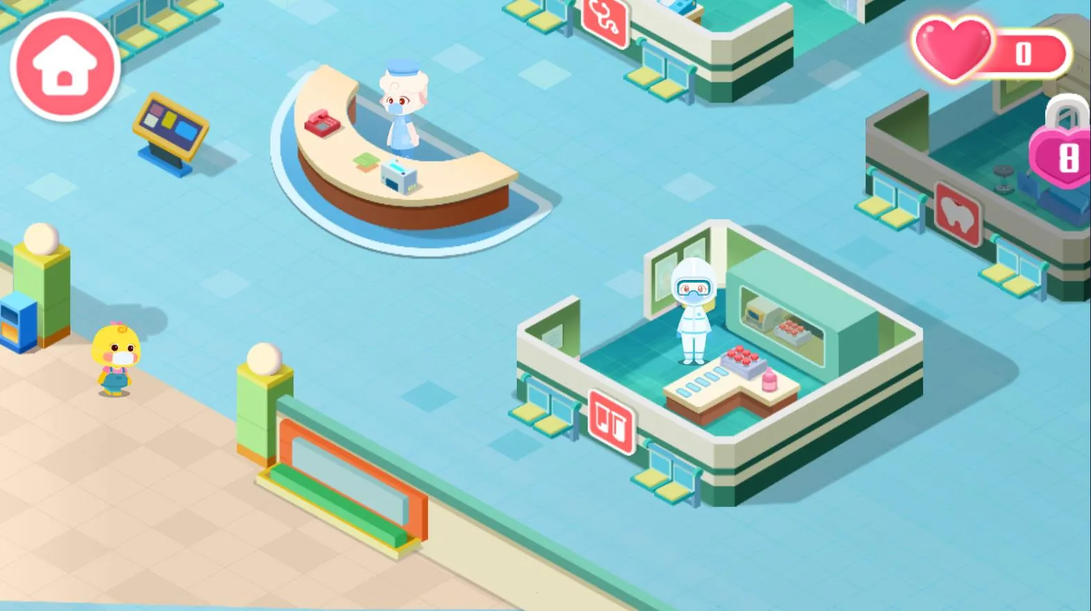 丰富科室体验:游戏涵盖眼科、牙科、药房、产科等7大科室,宝宝能在不同科室扮演医生,解决各种健康问题,如为小鸡弟弟检查眼睛、给小棕熊弟弟治疗蛀牙等,体验多样医疗工作。