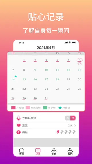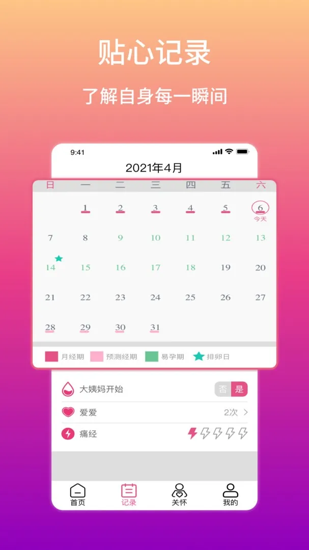 大姨妈生理期提醒最新手机版是专为女性设计的生理期记录与提醒软件。能精准记录经期,提前提醒,还有受孕提醒。提供健康知识,可加密隐私,自由设置提醒方式,自动生成报告,方便女性了解自身、做好准备。