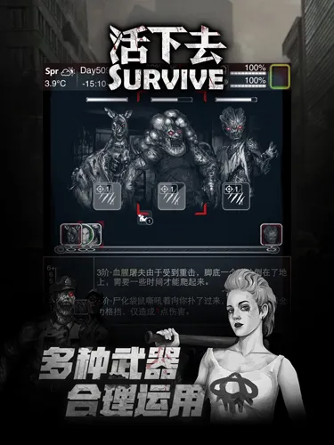 2、多样系统:具备疾病系统,僵尸并非唯一敌人,疾病也可能威胁玩家生命;还有天气系统,阳光明媚才适合出门,恶劣天气会增加生存难度,增添游戏的真实感和挑战性。