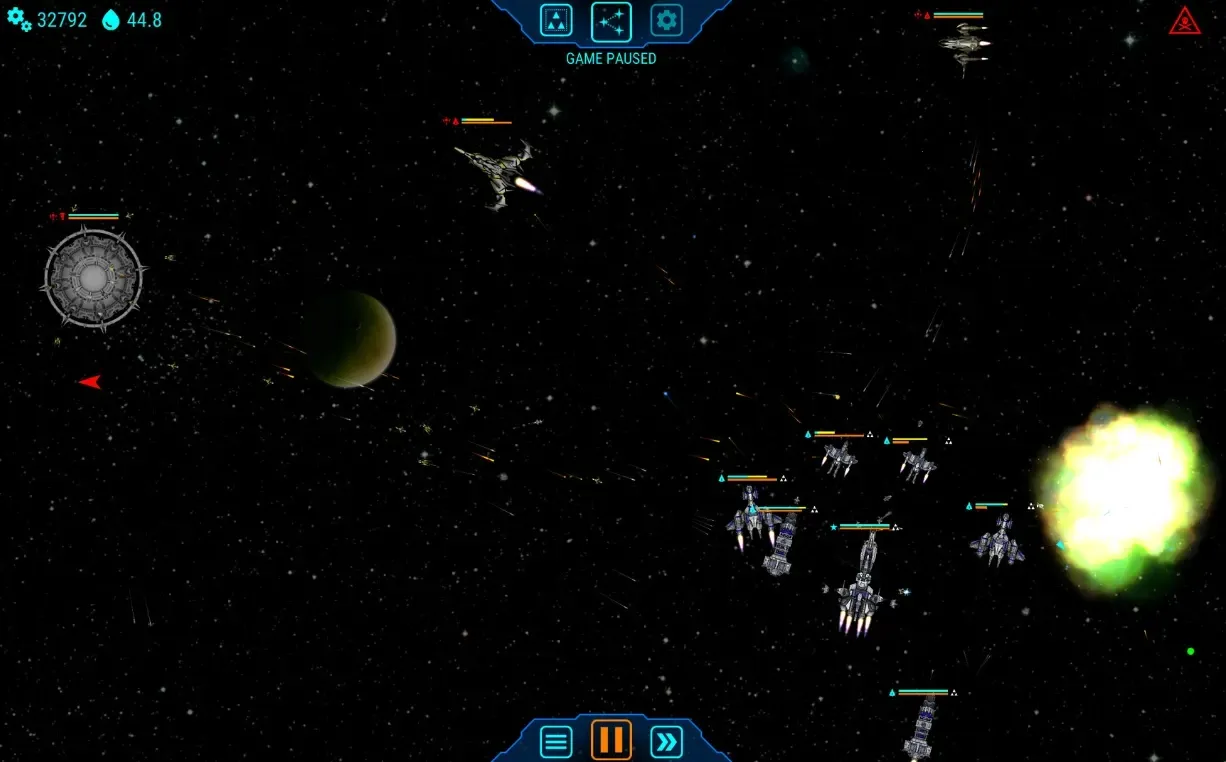 2. 灵活战术,应对强敌:面对大型敌舰时,可集中火力攻击引擎或武器模块,利用陨石带掩护规避导弹,通过分散阵型化解范围伤害。