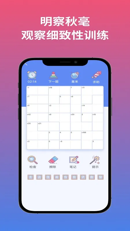 聪明格是一款超棒的办公学习软件。它以数字游戏形式提升脑力与逻辑思维,结合数独规则与创新玩法。有多种难度级别,从初级到高级,满足不同挑战需求。关卡是精心设计的智能方形题,要填1 - N数字,每行、列、组数字不重复。还包含观楼、华容路、数独等益智玩法,提供多样思维训练。其基于智能网格玩法,结合数独和算术规则,在网格填数字满足特定方程,锻炼逻辑推理。题目难度递增,适合不同年龄和思维能力的人。界面简单直观,操作方便,随时随地能训练思维,提高注意力和数学能力。采用循序渐进指导模式,助于理解思维过程,通过数字排列组合训练抽象推理能力,不同难度级别适配不同年龄段,还有实时反馈系统及时纠正错误想法,能帮你轻松收集知识,辅助学习,解锁更多知识与功能,超好玩!