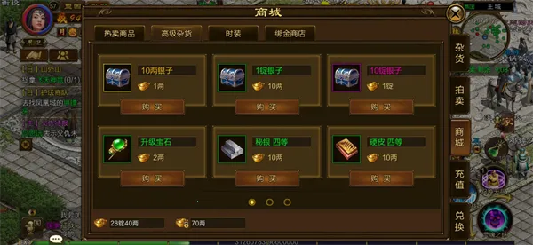 商城有出售升级宝石、硬皮、秘银,只要花费金子就能购买,也可在绑金商店使用绑定金子购买秘银、硬皮。每周商城还会退出限购礼包,可根据自己的策略购买礼包哦!