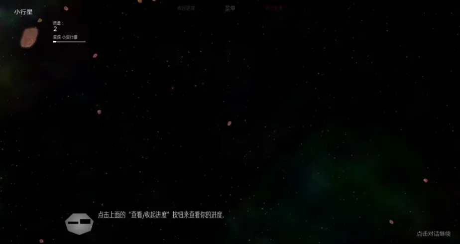 变大也不难,小行星升级小型行星,把它拖到另一个小行星撞在一起就行。小型行星升级小型恒星,移动到小行星附近,让小行星绕着转,然后点一下就能吸掉。之后的升级类似操作。