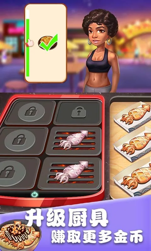 3、不断升级解锁精彩:通过做食物赚金币解锁升级餐厅工具、菜谱等,随着小吃街规模扩大,管理地方增多,游戏内容不断开放。