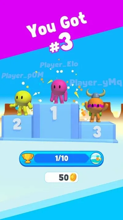 3. 竞技对抗性强:与 60 名对手同场竞技,要控制角色避开障碍冲向终点,还能干扰对手并谨防攻击,只有获得第一名才能获胜,每一关只有前五名玩家可进入下一关挑战。