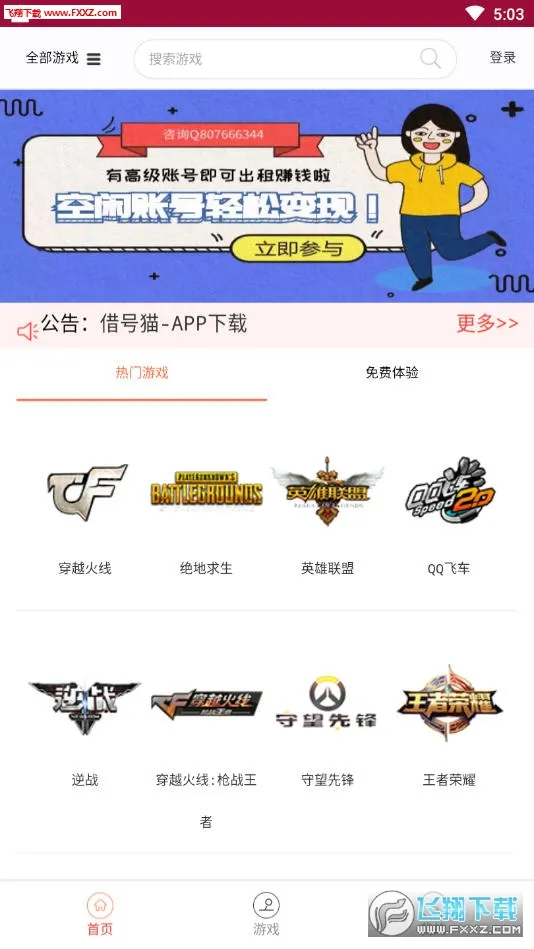 借号猫app是由济南市快推网络科技有限公司打造的游戏账号租赁平台,汇集上百款热门游戏账号,提供快速上号、一键登录等服务,有优惠活动,售后可靠,能保障账号安全,让玩家轻松体验游戏乐趣。