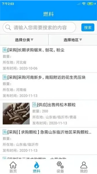 使用也简单,先下载安装。能发布燃料设备供求信息,在燃料供应、求购中心查看相关信息,设备专区了解设备详情。有最新采购推送,海量资源供交易对接,能收藏资源、开通会员享权益、查看订单详情,精准对接供求双方。有了它,您在生物质燃料领域的业务运作能更高效,轻松找到所需,让交易变得简单顺畅,赶紧试试吧!