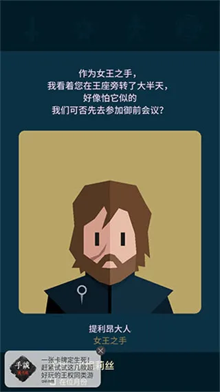 想知道在《王权权力的游戏》里地牢怎么走?这款游戏能满足你!它是一款超有趣的文字卡牌策略手游,以同名电视剧为蓝本。在游戏里,你能化身瑟曦、琼恩雪诺等经典角色,角逐铁王座。它画面抽象,玩法创新,有四项角色属性培养机制,选项对应增减属性数值,结果固定,得熟记影响来达成目标。各主线攻略丰富,比如龙母线、囧诺线等都有详细流程。游戏特色满满,简约画面搭配多元玩法,带来探索乐趣;让你直面对手,上演统治博弈;剧情精彩,抉择关乎局势走向。在这里,你能体验到当君主的感觉,通过决策左右七国命运,还能沉浸在精彩剧情中,感受权力的游戏魅力,快来试试吧!