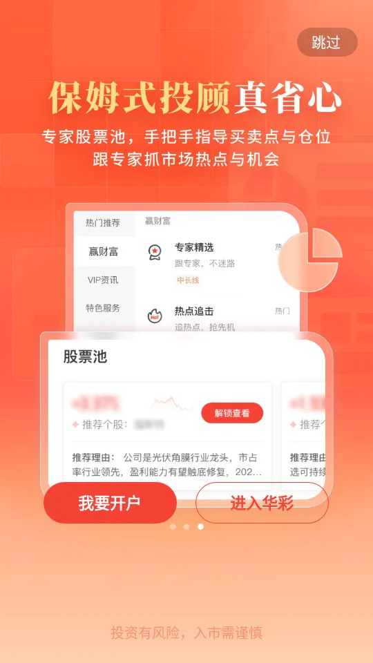 3. 资深专家服务:优选四百名资深专家,构建热点追击、专家精选、首席策略、策略战法、口碑基金五大产品体系。提供趋势判断、热点挖掘、板块解读、仓位建议、个股精选等股市干货,一键订阅,实时推送。