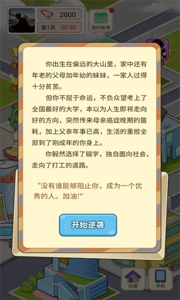 如果你正经历被劈腿、被冤枉的糟心事,想在虚拟世界里逆转人生,那这款游戏超适合你。在《逆转人生》里,你能体验从困境中逆袭的全过程。初始虽资源有限,但能像在现实中一样,合理规划时间、敏锐捕捉机遇来发展职业。比如初期资金紧张可买彩票,运气不好能去旧广场擦鞋,还能在红星广场开榴莲盲盒、河边采珍珠赚钱。它以写实手法还原打工日常,每周工作日有挑战,完成可获奖励。操作简单,能多模式切换感受不同人生轨迹。在这里,你能与非玩家角色自由互动构建人际关系网,随时调整策略。还能体验求职、置业、创业等丰富场景,从基层打工一步步积累经验走向成功,全方位满足你逆袭的渴望,让你在虚拟世界里重塑精彩人生。