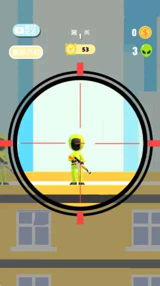 3. 助力道具与通关奖励:可自由使用专属助力道具,快速定位隐藏外星人或强化狙击能力,化解搜寻与射击卡点难题。每次通关都会记录玩家的命中率,同时能获得一定数量的金币,能在商店中购买武器和角色。