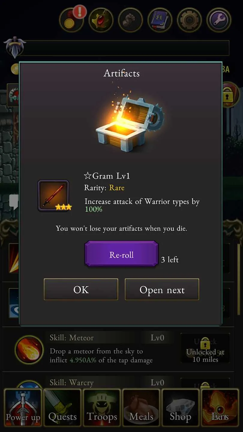 2. 独特的成长系统:战斗中士兵死亡可无数次复活,玩家自己死亡后除古代遗物保留外会失去其他资产并重新开始。游戏以数值膨胀方式变强,一开始伤害较低,随着强化士兵,数值会大幅提升,能让玩家亲身感受能力值膨胀的快感。
