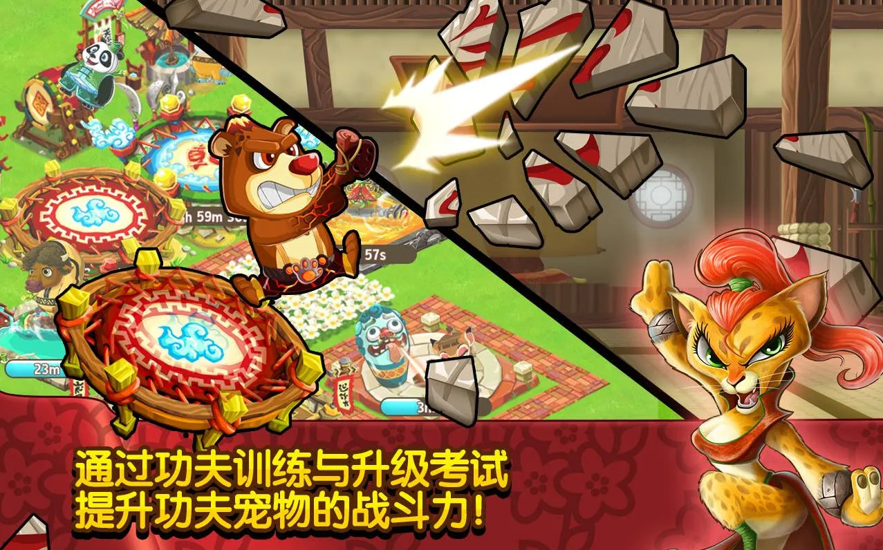 功夫宠物中文版是卡通风格的宠物养成模拟游戏。画面细致逼真,宠物有独特技能且能穿戴装备。通过闯关对战获金币道具升级宠物装备。游戏含七大板块,有多种特色玩法,如奇特阵法、群宠战BOSS等,百种宠物满足收集欲。