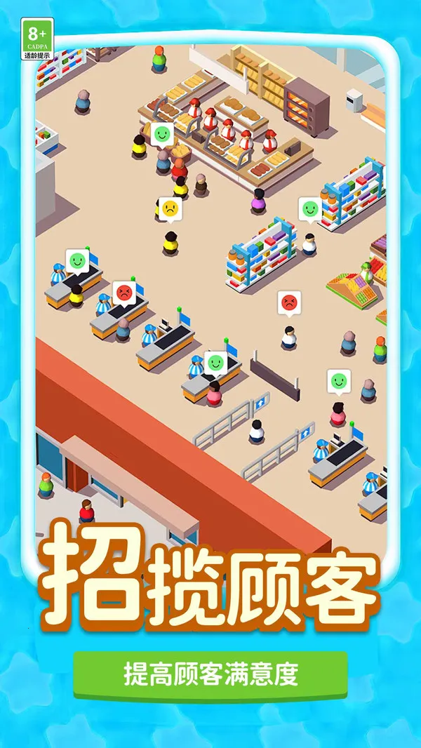 合理布局超市商品,积攒收入升级资源、增加设备,还能招募员工并为其升级。