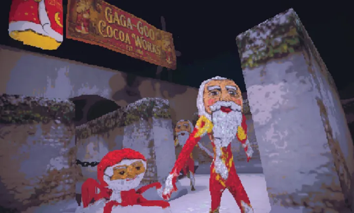 你作为著名巧克力工厂保安,夜班突遭爆炸,巧克力圣诞老人进化成恐怖形态追捕你。任务是阻止巧克力泄漏,穿越迷宫找阀门关闭,利用电击枪抵御敌人,在阴森3D工厂体验生存恐怖与迷因融合。