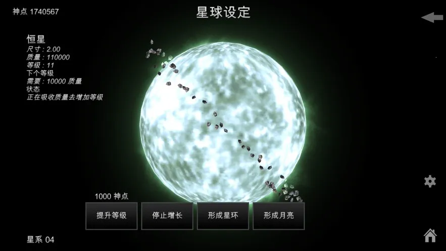 2. 多样的升级玩法:在主界面点击星球可消耗神点提升等级,随着等级提升,能在星球周围形成月亮,还可让星球转化成中子星、黑洞等不同形态。